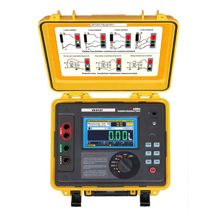 Weshine® VS-3127 bertenaga bateraiTes Megohm Meterdengan tampilan busur digital dan analog, dirancang untuk pengujian resistansi isolasi tegangan tinggi dalam pemeliharaan dan servis kabel, mesin pabrik berputar, transformator, switchgear, dan aplikasi industri.